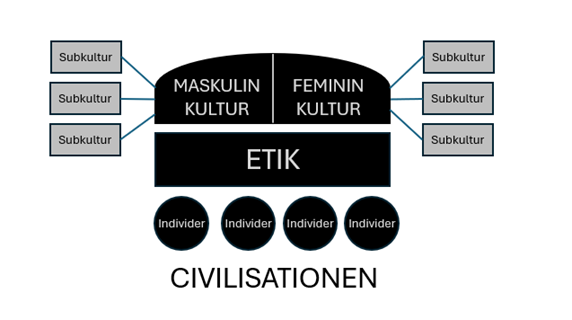 En civilisation består av ett antal individer som tillsammans skapar en etik därför etiken är det kitt som håller samman dem så de inte faller sönder till individer och därför dör ut. Etiken uppgår sedan i en av två olika kulturer men i vår värld talar vi om mängder av kulturer som vi lite fult här kallar subkulturer enbart för figurens pedagogik; subkulturer är ordagrant något annat och egentligen ett felaktigt ord då allt bara är kulturer. I grund och botten stammar alla dessa subkulturer dock enkom ur en av två olika kulturer: den maskulina eller den feminina. Dessa tre element som dessa texter består av är alltså: individen, etiken och kulturen och det är hela vår civilisation sen dag 1 och in i evigheten. Det som kan komma att rubba den här bilden är AI vilken varken kommer ha individer i den bemärkelse vi menar, en etik i den bemärkelse vi menar eller ens kulturer i den bemärkelse vi menar. Därför är också AI innehållet av det sista kapitlet som möjligen raderar ut hela den här bilden som vår text bygger på.