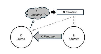 Låt oss minnas den reducerande modellen från avsnittet om Kärna, kontext och förhållande. Om vi ersätter D och B med en kultur A och en kultur B så förstår vi att kulturen A (fd D) alltså påverkas av kontext. Det innebär att om en annan kontext – Kultur C – utsöndrar fenomen mot kultur A så kan kultur A inta en annan inställning till kultur B än kultur C.